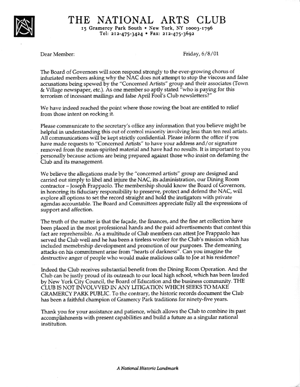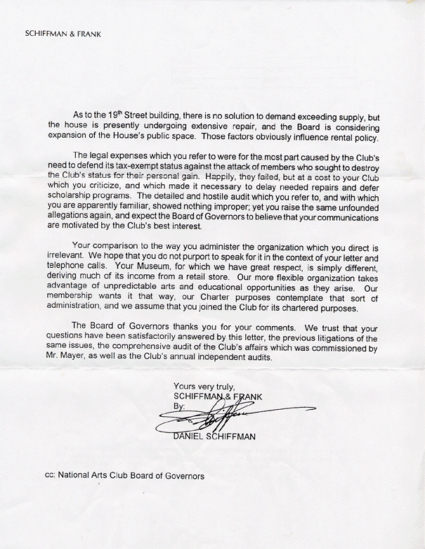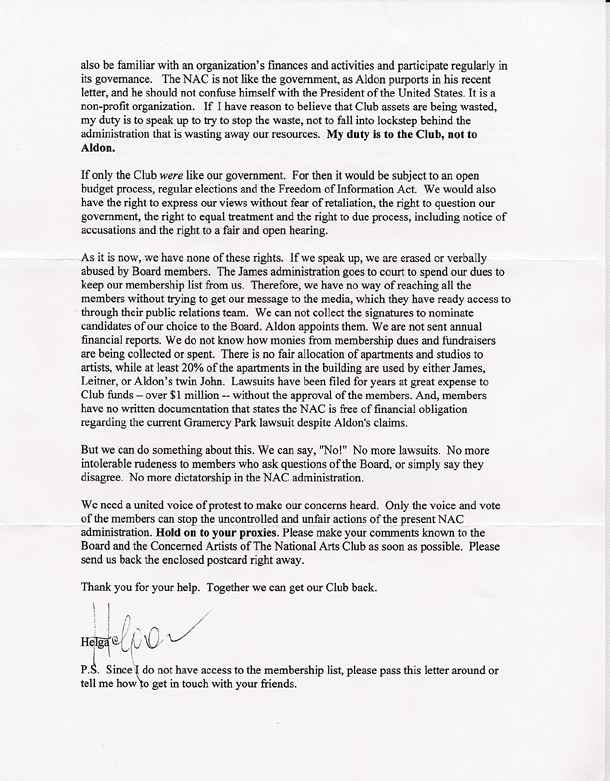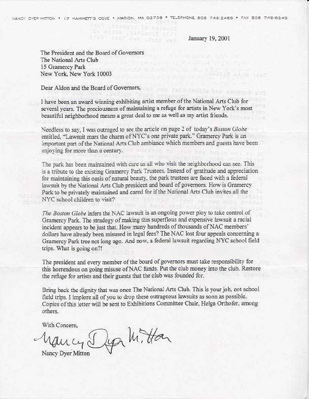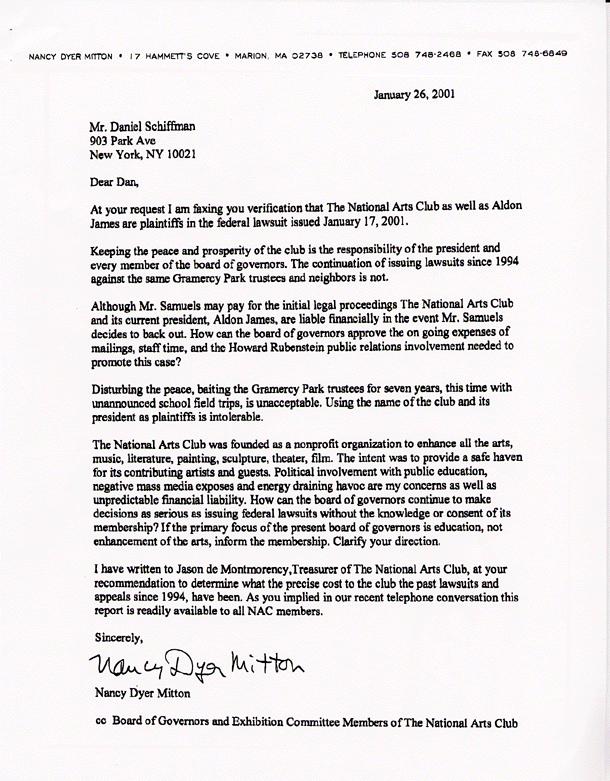 Nancy Mitton sent this letter to Board member and legal consultant to the Board, Daniel Schiffman, after he denied to her in a phone conversation that The NAC was a plaintiff in the Federal civil rights lawsuit against the Gramcery Park Trust and demanded proof. This has the appearance that Mr. Schiffman either was not himself aware at that time that Aldon James had committed the Club to this lawsuit, thus without initial Board knowledge and approval, or that he did know but misrepresented the situation to a concerned NAC member.