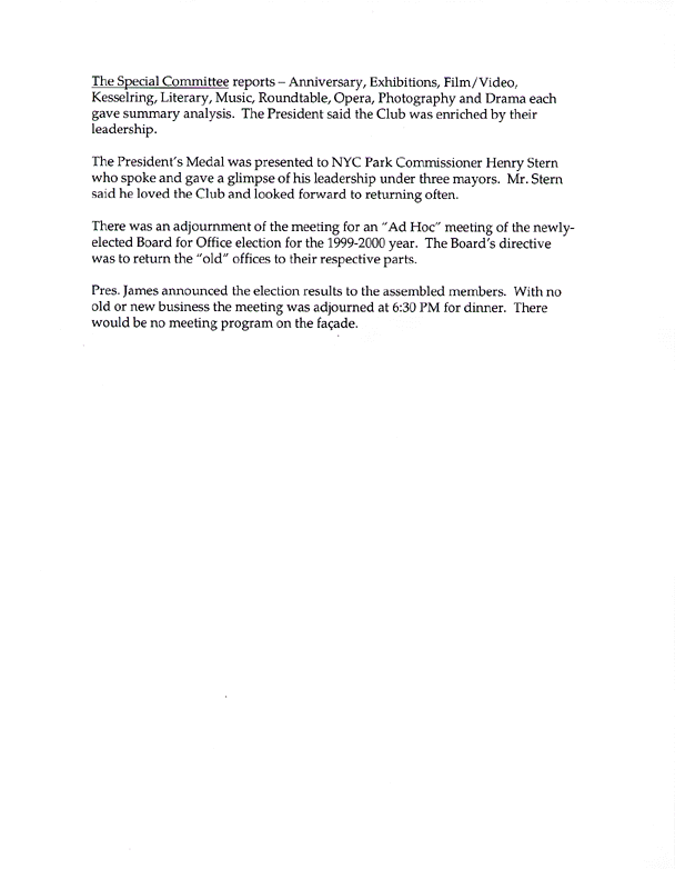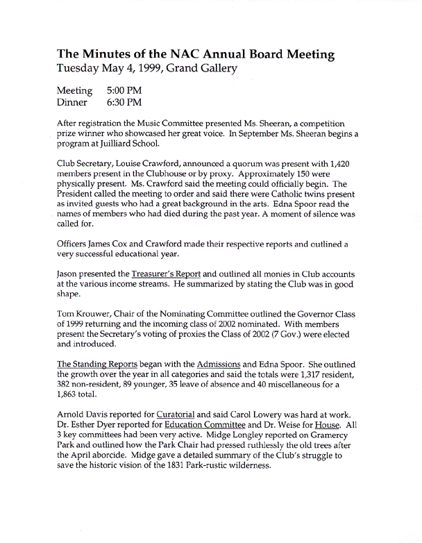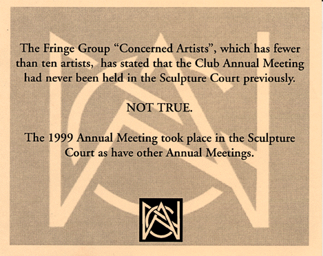 Aldon sent out the above card in an official club mailing to counter charges by Concerned Artists that the 2000 annual meeting was held in the small Sculpture Court rather than the spacious Grand Gallery as a slick maneuver to keep out dissidents. The minutes below prove that Aldon either has a faulty memory or lied to the membership.