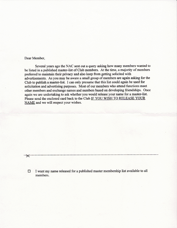 Included with Aldon's mailing is this vague form designed to create the impression that calls for access to the Club's membership list are for some sort of cynical commercial motive. In fact, access to the membership list of any not-for-profit corporation such as The NAC is not a favor to be granted, but a right by law as long as it is strictly for club business (click here for citation). The Attorney General has insisted such in the past in regards to the Club (click here for affirmation). All the prestigious clubs Aldon names in his letter above, for instance, publish such lists without the desperate litigiousness and melodrama of the James/Leitner administration. If these clubs, whose members include some of the wealthiest, most influential people in the world, trust the integrity of their members, what does that say about Aldon James' attitude towards The NAC's present membership, much of whom became members under Aldon James' supervision or sponsorship? However, Aldon is not entirely wrong about crass commercial exploitation of The NAC membership list. This has been done in the past -- by the James/Leitner administration itself (click here for example).