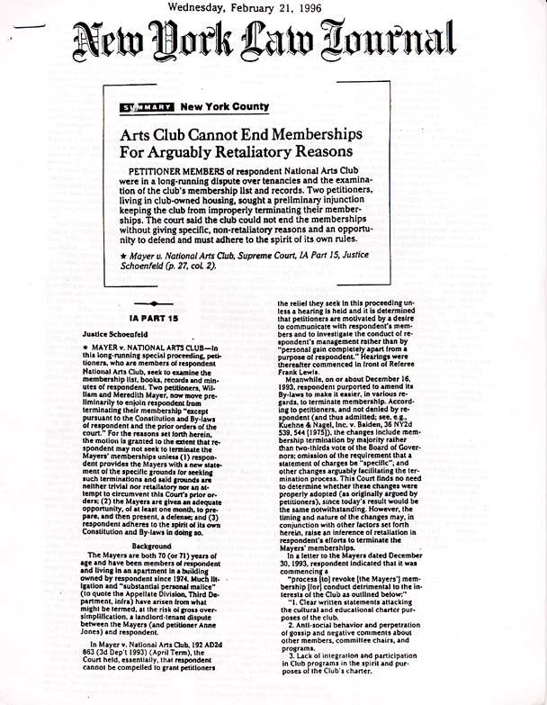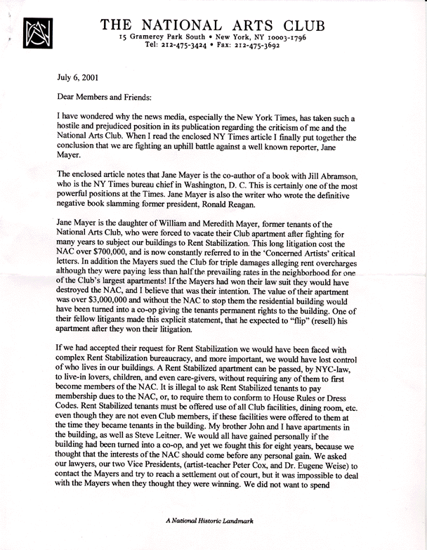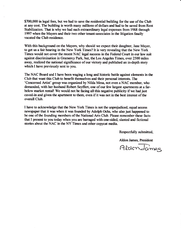 Jane Mayer co-authored a book with Jill Abramson about David Brock and the campaign to discredit Anita Hill during the Clarence Thomas hearings. How this gives her power over the Arts Section of the New York Times is unclear. Why she would only exercise this alleged power years after her parents were in legal conflict with Aldon James is unexplained. The Mayers never demanded treble damages. The apartments were already under rent stabilization at the time Aldon/Leitner assumed power in 1985. They did insist on a written agreement that they would retain rent-stabilization benefits if they supported the proposed administration scheme, supposedly for the good of The Club, to remove the benefits. Why the Mayers would want to destroy The Club is also not explained (musical composer Bill Mayer was presented with an NAC citation of honor in 1985). The legal costs were an accumulation of the James/Leitner administration resisting any legal attempt to gain transparency of operations by members, including the Mayers, during the 1990's. How a free-market coop can be rent-stabilized, still owned by The NAC and yet "flipped" by a tenant for a profit is also not explained. Finally, how below market rents would have destroyed The NAC needs to be elaborated on. Considering that Aldon James, twin brother John, Steven Leitner, and several NAC governors all enjoy this perk, undeclared on their income taxes, does that mean that the Club is on the verge of destruction?