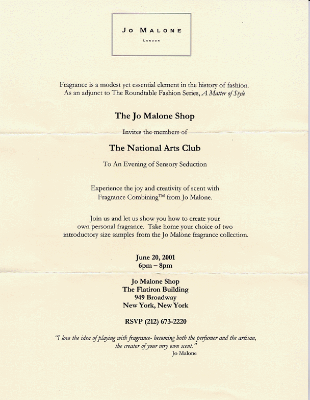 This mailing to promote the Jo Malone perfume shop was sent to the membership ostensibly as a Roundtable Committee event for sampling perfume.