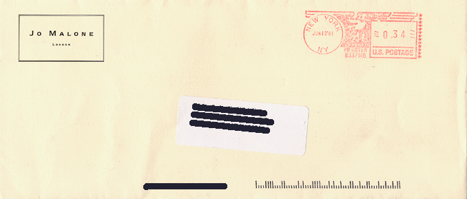 However, notice that the mailing was sent by the Jo Malone Company itself in its own envelope (below), not as part of a normal club mailing of events. Therefore, Jo Malone had to have access, even indirectly, to the entire club mailing list -- the same access strictly for club business that has been denied by the James/Leitner administration and fought against in the courts at a cost of hundreds of thousands of dollars to The NAC, for the purpose of preventing viewpoints and facts contrary to James/Leitner administration mailings or its grip on the elections process.