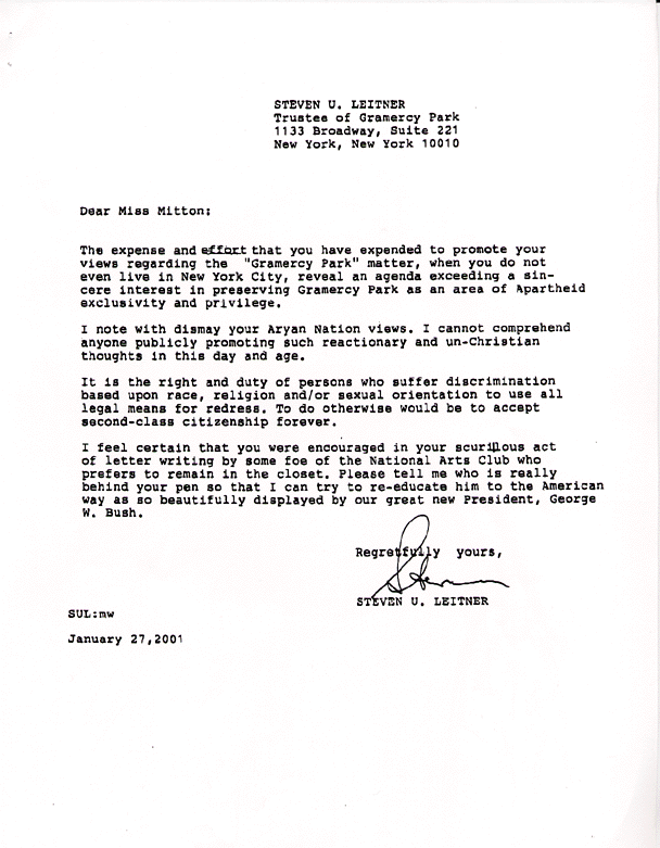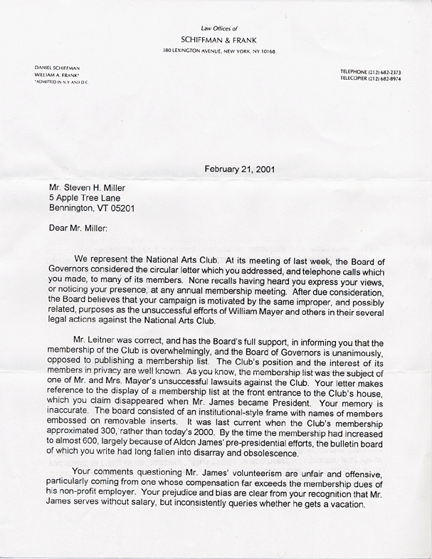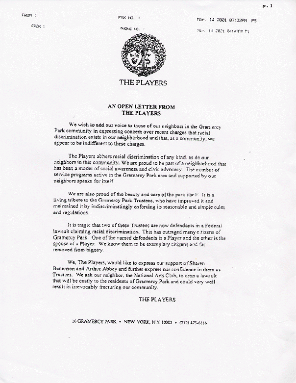 Former Board of Governor Member Steven U. Leitner, companion to O. Aldon James, replies to member Nancy Mitton's concern over the Club joining as plaintiff in the Federal civil rights suit against the Gramercy Park Trustees, Sharen Benenson, and Arthur Abbey (above).