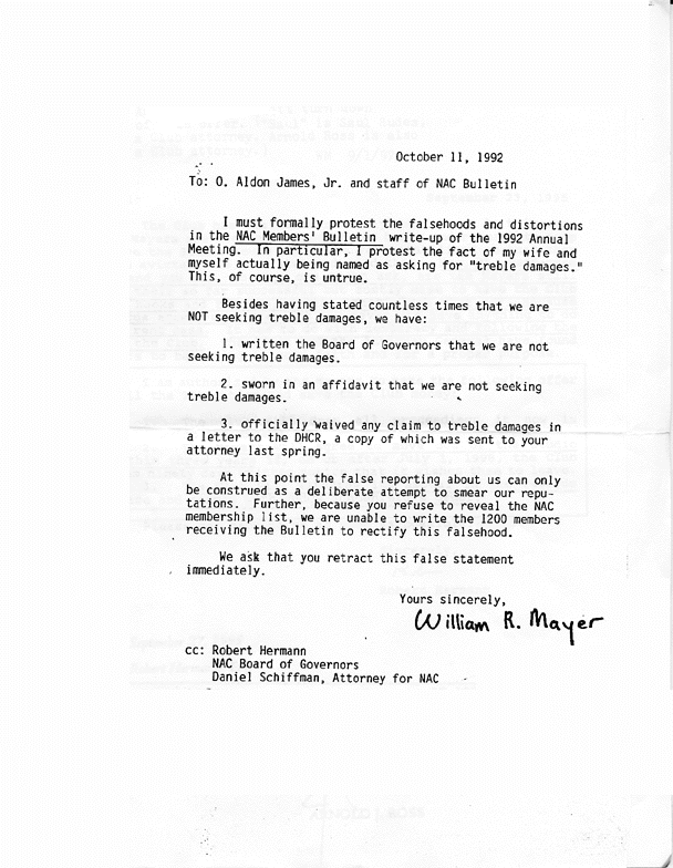 In 1992, Bill Mayer committed himself in writing to never having any desire for treble-damages in the apartment/rent stabilization conflict. Aldon James nevertheless dredges up this claim whenever it suits him.