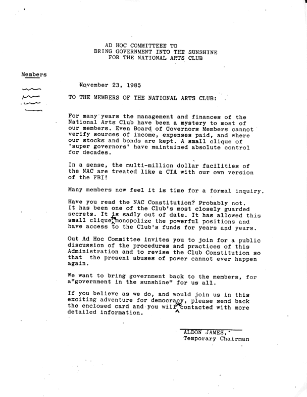 An unsigned letter to the membership purportedly in the name of the Board of Governors, presumably from Aldon James, threatening Concerned Artists and Town & Village newspaper -- the penalty for asking too many hard questions.