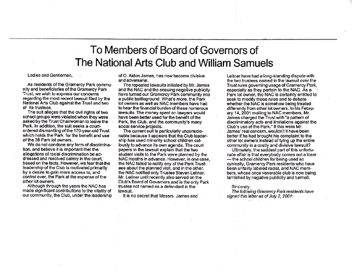 On August 14, 2001 Concerned Artists mailed to The NAC membership a copy of the Gramercy Park community's open letter to the community and the media. The community eventually obtained over 650+ signatures from Gramercy Park residents who are disgusted with the conduct of the Aldon James/Steven Leitner administration.