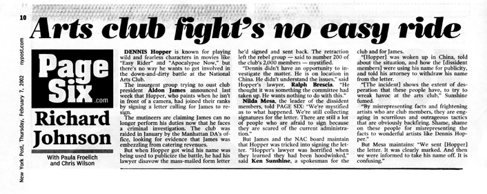 Ed. Note: Concerned Artists never made any announcement to the New York Post regarding Dennis Hopper, nor will we ever exploit any prominent supporter of Concerned Artists for publicity purposes. We cannot however control media efforts to obtain information or how the media uses it afterwards.