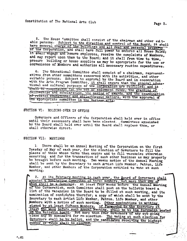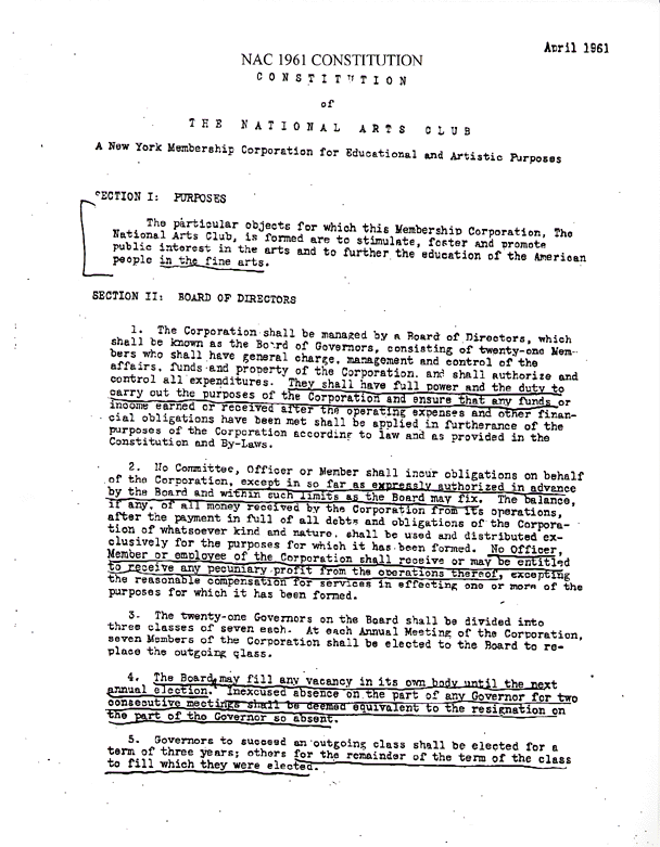 The original constitution of The National Arts Club is on file at the Archives of American Art in Washington, D.C. Notice that at no time does the document envision the Club as an "educational" institution as has been emphasized recently during the