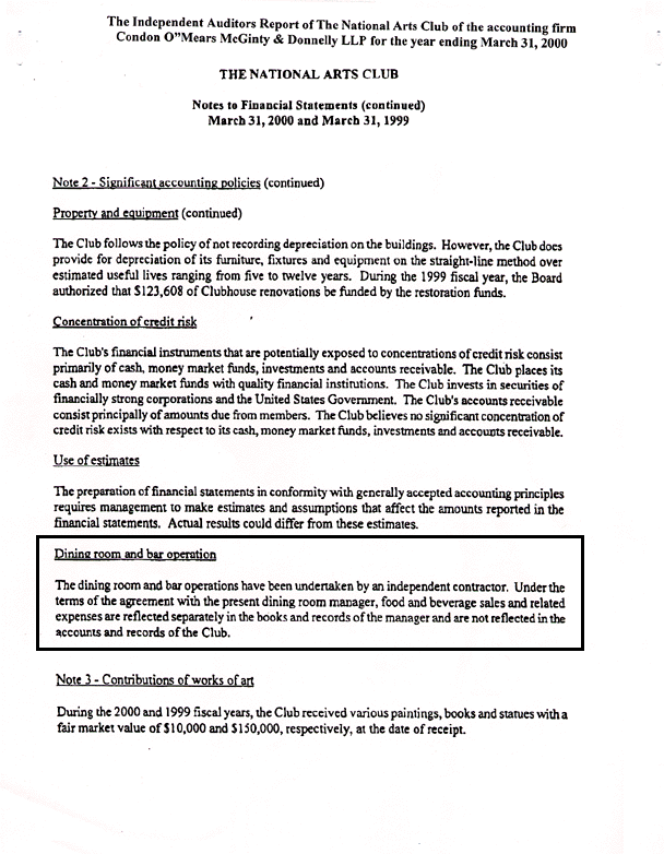 The National Arts Club was independently audited by a highly reputable accounting firm, M.R. Weiser and Company, stemming from a dispute beginning in 1991 between the James/Leitner administration and 7 club members, over erratic financial reports and an unsolved embezzlement reported in the NY Times.