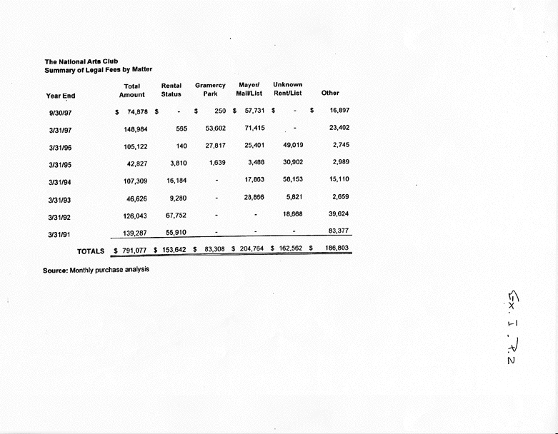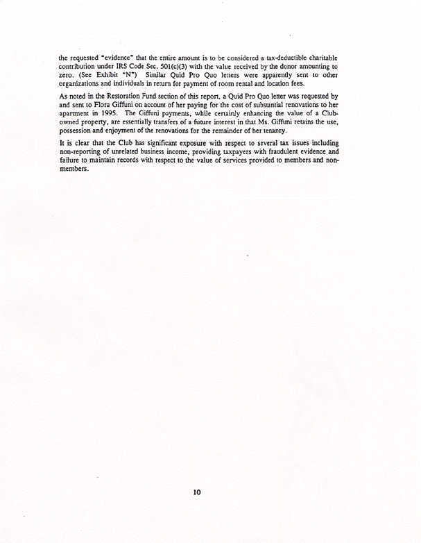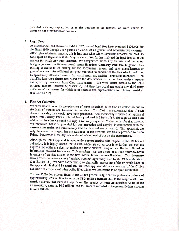The Weiser Audit found considerable questions concerning the high legal expenditures of the James/Leitner administration, the peculiar lack of any reported income from the entire Dining Room/catering operation within its premises, and the lack of information concerning donations made to The National Arts Club, a charitable institution. Below is the Weiser summary of their findings, followed by several key exhibits from the audit. The entire report is on public record and available for inspection.